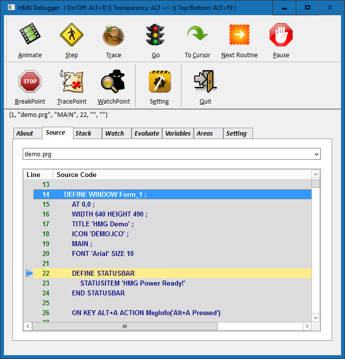 HMG Debugger is an embedded native GUI debugger in the HMG library that allows you to debug your source code of an application while your executable file is running. HMG debugger is invoked when compiled the application with the \/d option on the command line or with the option Project->Debug of the main menu of the IDE, eg.